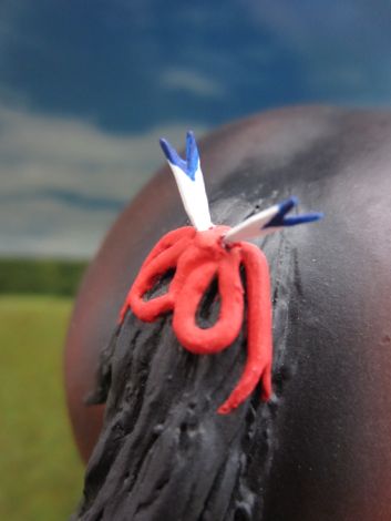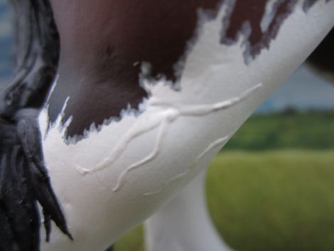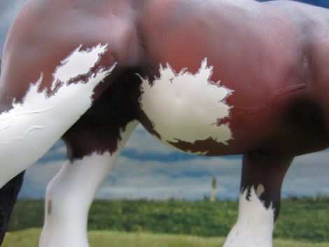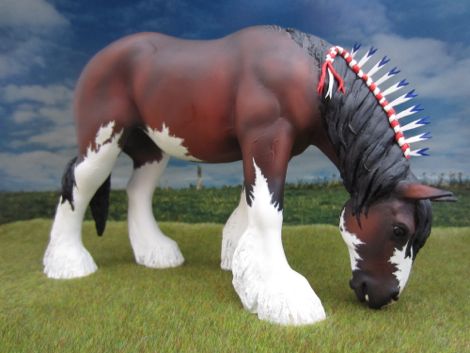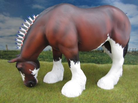 Northlight P 1132 Grazing Shire Mare, diese wurde 1996 aufwendig von Maren Landschoof verändert, sie wurde komplett überarbeitet, bekam eine neue Mähne, einen neuen Schweif, Mähnenbänder und Mähnenschmuck, Schleifen in den Schweif und Adern an den Beinen, Bauch und im Gesicht, man kann ihre Zähne sehen, sie hat kleine „Warzen“ am Maul, wunderschön schattiert bemalt mit typisch viel Weiß an Beinen und Bauch, mit „Mapping“! Ganz einmaliges Pferd! € 150,-