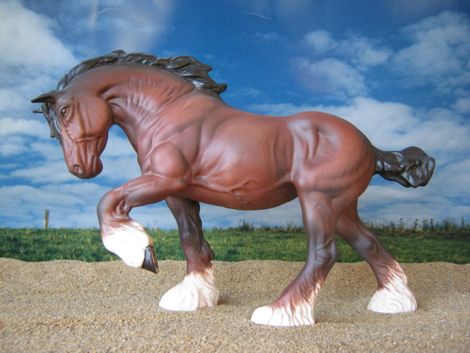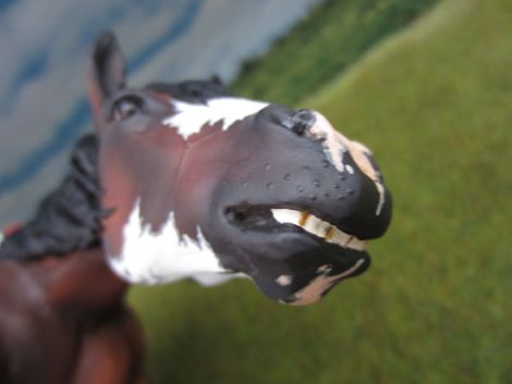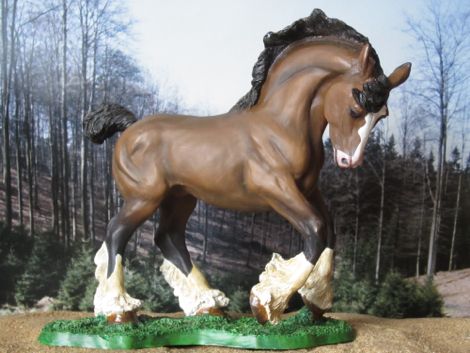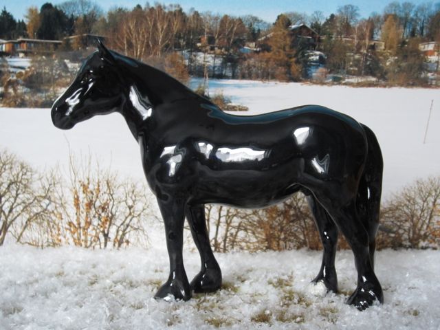 Living Stone # 26780 bockender Shire auf Platte, ein seltenes und sehr schönes Modell aus schwerem Vollguss-Resin, der Shire tobt gerade fröhlich über seine Weide. Das Modell hat Traditional-Größe, ca. 23 cm hoch und 25 cm lang. Modelle dieses Herstellers sind in Deutschland selten zu finden und werden, glaube ich, nicht mehr hergestellt. Der Teilinhaber von Living Stone eröffnete später die Firma „Corlett Collectables“, von der es auch Pferdemodelle gibt. Ich habe ihn seit 2002, aber er war zuvor schon bei einer anderen Sammlerin, € 80,- |