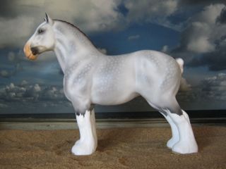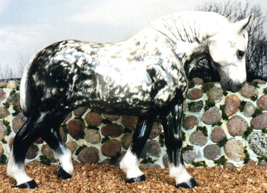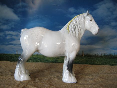 Lenham Pottery Percheron, sehr selten und Spezialanfertigung aus GB, Firma existiert nun nicht mehr. Sehr groß (1:9), Wallach mit Schlitz in Mähne für das Zaumzeug, dapple grey matt, markiert unter dem Bauch mit:”LP Norwich A 1996", statt € 280,- nur noch € 100,- |