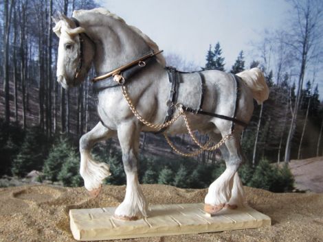 Cloudside Figurines Shire von 1994 als Grauschimmel, sehr detailierte und farblich schöne Skulptur, anatomisch korrekt, mit anmodelliertem Kummetgeschirr und Zaum, steht auf einer kleinen Platte, die Steinplatten darstellt und hat auch einen Holzsockel dazu, von dem man die Figur aber abnehmen kann. Ca. 17 cm hoch und 22 cm lang (ohne Platte), € 90,- |