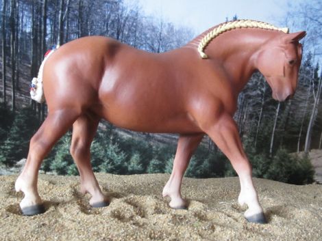 Northlight P1150 Suffolk Punch in schöner matter Fuchsfarbe mit gelben Mähenbändern und rot-blauer Schleife im Schweif, sehr typvoll, von 1994, 18 cm hoch und 23 cm lang, statt € 100,- nur noch € 50,- |